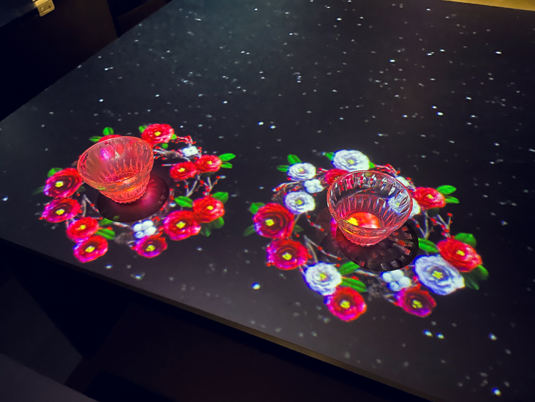 테이블위에 차잔을 올리면 아름다운 동백이 차잔을 수놓는다.