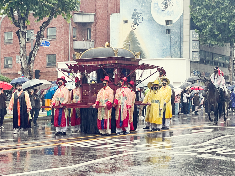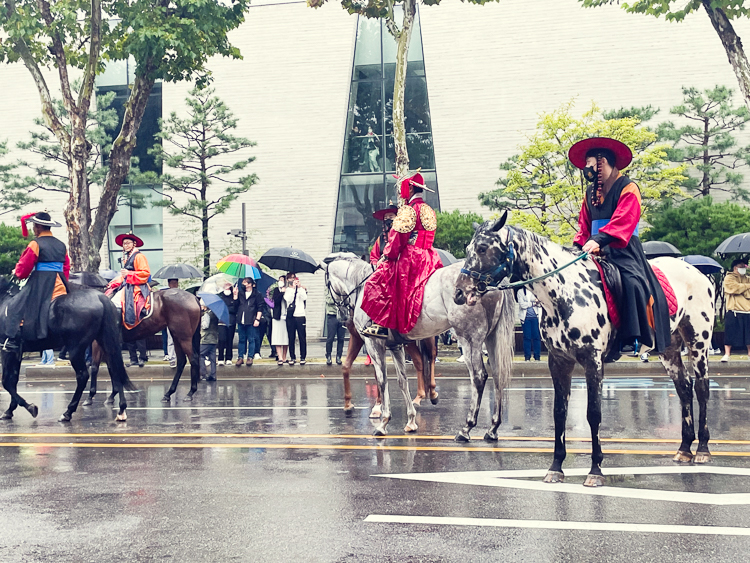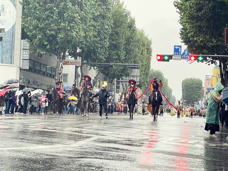 의복위에 우비를 입어 멋진 행차의 모습은 다소 아쉬움을 자아냈다.